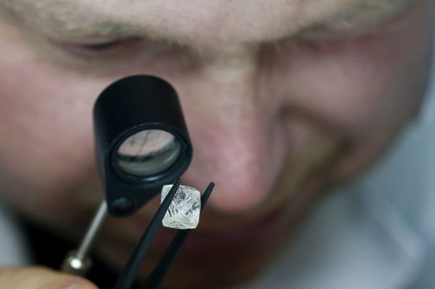 Группа "Алроса", крупнейший в мире производитель алмазов, протестировала рублевые сделки с индийскими и китайскими клиентами. Необработанный алмаз оценивается в центре сортировки алмазов "Алросы". Фото: Александр Рюмин/Тасс/Зума Пресс