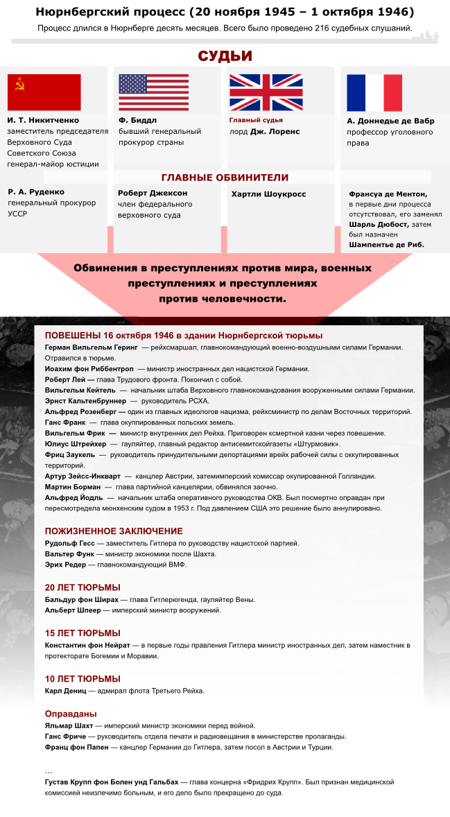 Еще задолго до подписания Германией акта о безоговорочной капитуляции, в Московской декларации 1943 года, была определена судьба идеологов и руководителей Третьего Рейха. Страны антигитлеровской коалиции договорились об обязательном проведении суда над военными преступниками. Поскольку нацистская Германия в своей политике на международное право плевала с особой дерзостью, материалов для суда оказалось в изобилии.