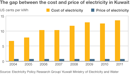 "В 1996 году Кувейт снизил свой тариф на электричество с 27 филсов за кВт/ч до 2 филсов, и с тех пор цена осталась на том же уровне. То есть около 1 цента США", - сказал он Би-Би-Си.