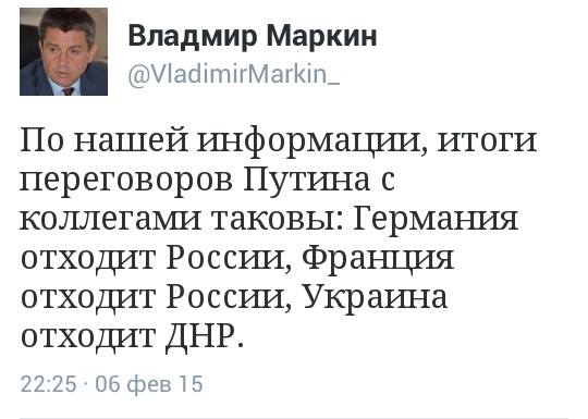 Очень хочется мира, но уверен, что от сегодняшнего ночного дипломатического совокупления не родится ничего или почти ничего. Слишком много "если", которые со стопроцентной вероятностью будут нарушены на том или ином этапе. При том уровне адекватности воюющих сторон, патронируемых Россией, ЕС и США, договоренности будут похерены еще на стадии разруливания Дебальцевского котла. Дай Бог, чтобы я ошибался.