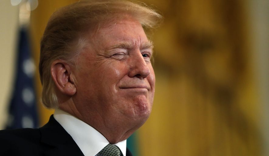 Президент Дональд Трамп подмигивает во время ежегодного преподнесения чаши с трилистником с ирландским премьер-министром Лео Варадкаром в четверг, 14 марта 2019 г., в Восточной комнате Белого дома в Вашингтоне. (AP Photo/Жаклин Мартин)