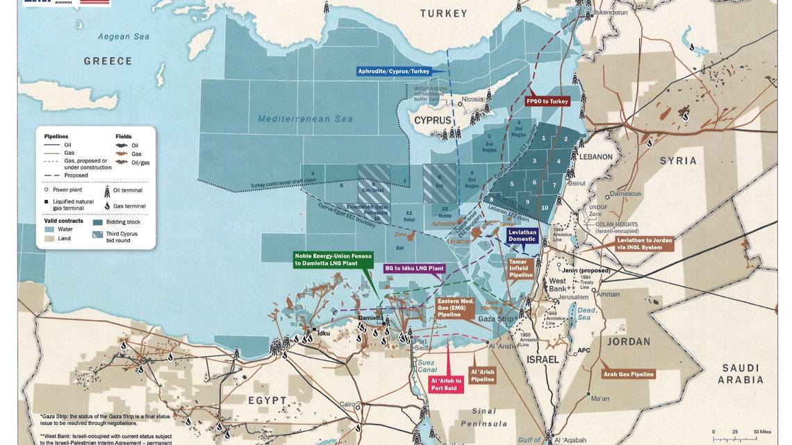 Согласно трем высокопоставленным чиновникам администрации, эта карта - рассекреченная и полученная McClatchy - вдохновила членов Совета по национальной безопасности рассмотреть в качестве первоочередной задачи создание газового форума в Восточном Средиземноморье, который будет одновременно способствовать росту экономик нескольких стран и свяжет эти страны, находящиеся в конфликте в течение десятилетий.