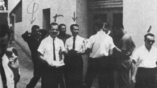 Фотография комиссии Уоррена убийцы Джона Ф. Кеннеди, Ли Харви Освальда, показанного в белой рубашке слева на фотографии. Мужчина, стоящий справа от него, ближе к центру фотографии, никогда не был идентифицирован комиссией.