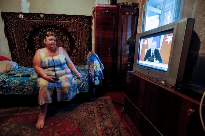 Для украинской пенсионерки Ольги Шажковой переключение телеканалов в прифронтовом городе Авдеевка является однообразным делом. Когда на экране ее телевизора появляется большим планом лицо Владимира Путина, она переключается на другой канал со вздохом, попадая на официальный канал российской армии.