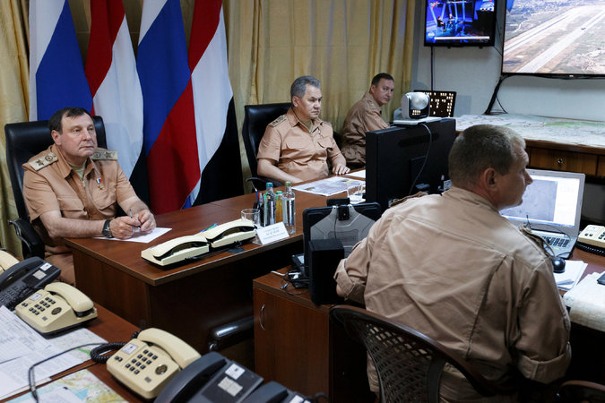 Российский министр обороны Сергей К. Шойгу, в центре, посетил авиабазу в северной Сирии в июне. Российская воздушная кампания против поддерживаемых ЦРУ повстанцев принудила их к отступлению. Фото - Вадим Савицкий/Российское Министерство обороны, через "Рейтер"
