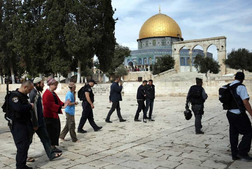 Трое еврейских верующих в сопровождении израильских сил безопасности посещают охраняемую территорию рядом с мечетью аль-Акса на Храмовой горе, известной среди мусульман как Харам Аль-Шариф - Благородное святилище, 28 октября 2015 года. На заднем фоне виден купол мечети "Купол скалы". (Фото: Томас Коикс/AFP/Getty Images)