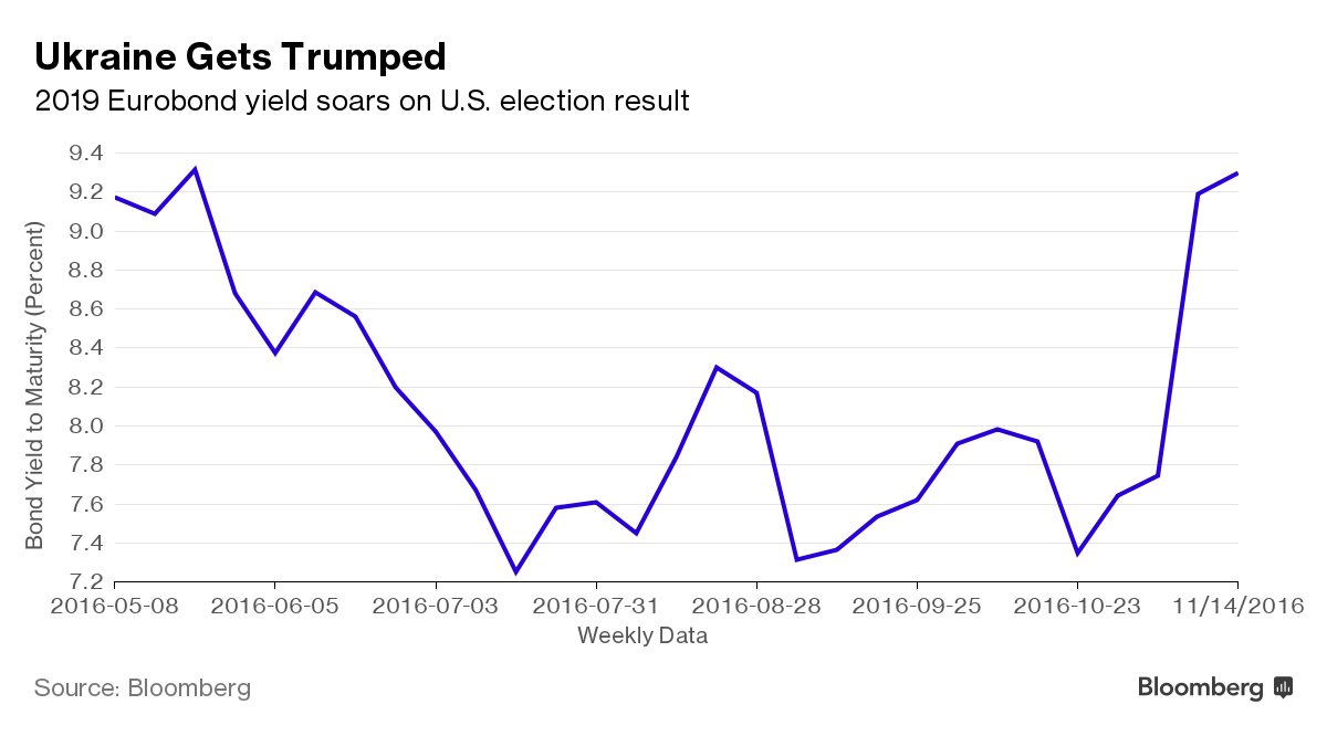 Это ощущение передается и на рынке облигаций, где украинские долговые обязательства являлись перспективным вариантом в течение большей части этого года, так как валюта и инфляция стабилизировались, а экономический рост медленно продвигался в сторону положительных значений. Доход по трехлетним украинским облигациям вырос более чем на два процентных пункта после выборов в США, так как инвесторы обратились в бегство.
