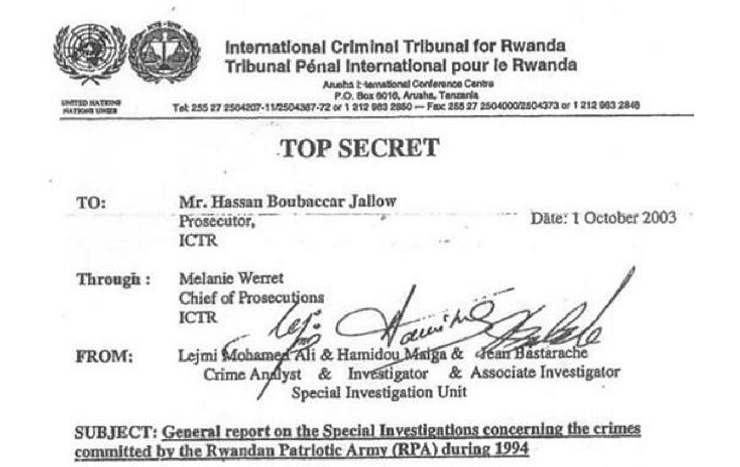 Этот документ, имеющий отсылку к теме "Общий доклад по специальным расследованиям относительно преступлений, совершенных Руандийской патриотической армией (РПА) в течение 1994 года", был отправлен тогдашнему прокурору Хасану Джаллоу тремя членами отделения специальных расследований прокуратуры. Он предоставляет прокурору доказательства, которые они собрали, что РПА (Руандийский патриотический фронт был переименован в Руандийскую патриотическую армию в 1994 году, после его победы в гражданской войне в Руанде - прим. перев.) совершила массовые убийства тысяч хуту в различных местах на территории Руанды, например, в Бьюмба, Кабгаи, Рамбара, Джитарама и Бутаре, а также убийство троих католических епископов и девяти других священников в одной церкви. Обстоятельства, описанные в докладе, подтверждают доклад Джерсони об аналогичных убийствах, а также подтверждают показания свидетелей, которые мы слышали во время судебных разбирательств, что силы РПА внедрили людей на гражданские баррикадные заграждения для убийств с тем, чтобы возложить вину за преступления на войска руандийского правительства и молодежное движение, известное как "интерахамве".