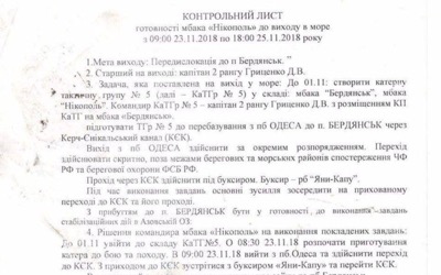 Россия обнародовала допросы троих украинских моряков, арестованных во время инцидента в Керченском проливе 25 ноября 2018 года, и один документ (на фото), захваченный на одном из кораблей.