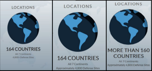 Надписи на иллюстрациях: "Позиции - 164 страны - Все 7 континентов - 4800+ оборонных объектов", "Позиции - Более 160 стран - Все 7 континентов - Приблизительно 4800 оборонных объектов"