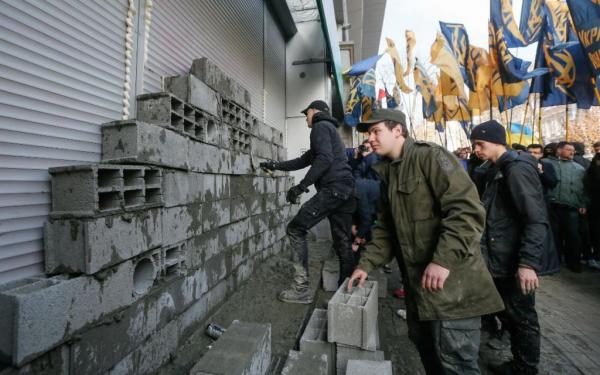 Украинские протестующие строят стену 13 марта у киевского офиса российского банка "Сбербанк", требуя положить конец работе российских банков в Украине. Украинский президент Петро Порошенко ввел годичные санкции на этой неделе против пяти российских банков, включая "Сбербанк". Фото - Сергей Долженко/ЕРА