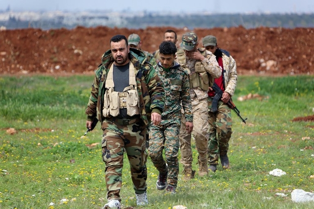 В начале апреля члены сирийских правительственных сил проходят рядом с городом Куманах в сельской местности в центральной провинции Хама (AFP)