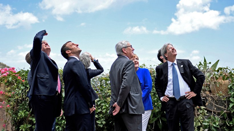 Президент США Дональд Трамп, французский президент Эммануэль Макрон, британский премьер-министр Тереза Мэй, президент Еврокомиссии Жан-Клод Юнкер, федеральный канцлер Ангела Меркель и итальянский премьер Паоло Джентилони смотрят вверх: на полях саммита "семерки" проходила авиационная выставка. Стефан Де Сакутин / "Рейтер"