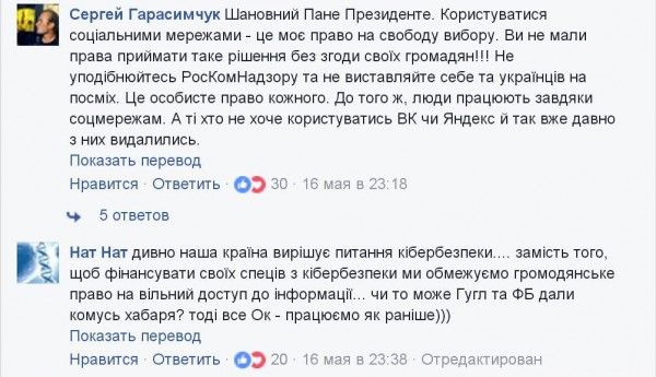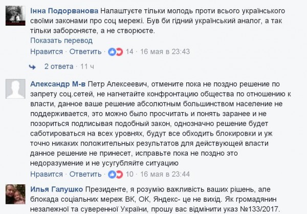 P.S. Вообще-то на ФБ-странице украинского президента Порошенко после того, как подавляющее большинство комментаторов выразило возмущение запретом, его более поздний пост - "Одразу після припинення агресії РФ, після того, як останній солдат РФ залишить Україну, рішення про санкції щодо соцмереж буде переглянуто” - вызвал внезапное одобрение запрета уже от других комментаторов, мол, так и надо и давно пора. Фокусник.