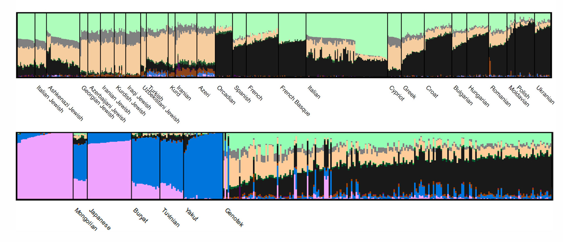 Каждому кластеру соответствует свой цвет, а популяции отличаются (или не отличаются) долями кластеров в геноме. Вот тут лежит интерактивная версия картинки для подробного изучения: наведите мышку и прокрутите, чтобы увидеть все популяции или рассмотреть какую-то из групп подробнее.