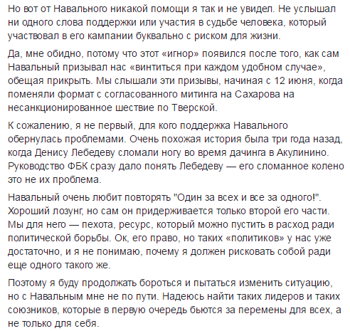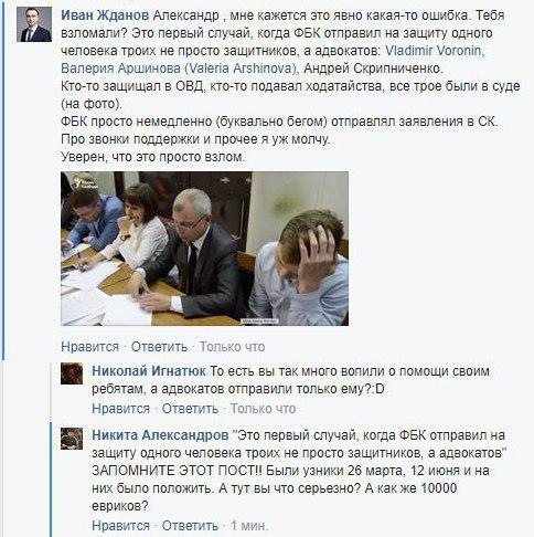 Не сотвори себе кумира. Навальный и активно пиарящие его либеральные СМИ совершили опрометчивую ошибку. Сначала они раздули медийную фигуру из обычного неуча, брошенного Навальным на амбразуру, а теперь не знают, что и делать, ведь подросток обвиняет «кандидата-20!8» в предательстве. Но обо всём по порядку. Навальный арендовал свой штаб в Москве без согласования с реальным собственником через субарендаторов. Реальный хозяин помещения узнал об этом и подал в суд. Было возбуждено дело по 330 статье (самоуправство). В ночь на 6 июля правоохранители провели в незаконно захваченном сторонниками Навального помещении обыск. В «штабе» на тот момент зачем-то ночевал волонтёр Александр Туровский. Что он там делал до сих пор непонятно, вероятно, играл роль бесплатного сторожа, охраняя незаконные агитационные материалы (Навальный не регистрировал свою агитацию, чем нарушил закон о СМИ). На приказ правоохранителей лечь на пол, Туровский промолчал и зачем-то стал шарить руками под одеялом. Боец Росгвардии незамедлительно приступил к задержанию, чему Туровский активно сопротивлялся. После он также отказался предъявить свой паспорт. Далее Туровского доставили в отделение полиции, а затем в больницу (при задержании волонтёр получил несколько синяков и шишек). Либеральные СМИ и сторонники Навального, разумеется, максимально раздули историю, выставляя Туровского жертвой «полицейского режима», оклеветали даже врачей, представив их чуть ли не подручными доктора Менгеле. Когда же из «избитого» волонтёра был выжат максимальный медийный капитал, о нём просто-напросто забыли. Вот тут Навальный просчитался. Не стоило обижать новоявленную звезду. Туровский воспользовался, неожиданно нагрянувшей славой, чтобы отомстить обидчику. Бывший волонтёр написал слезливый пост, обвиняющий Навального в предательстве. Вот скрин с facebook Туровского:  Прозрение наступило слишком поздно. Достаточно немного больше времени посвятить учёбе, немножко подтянуть правоведение, чтобы понять, что для Навального его сторонники просто «мясо», которое он подталкивает на незаконные действия. Забавно, но Туровский своим постом задел нервный узел среди подельников Навального, те всполошились и стали оправдываться. Ляскин и Жданов, даже выразили надежду, что страничку Туровского взломали. Надежда, как говорится, умирает последней. Вот их истерика: