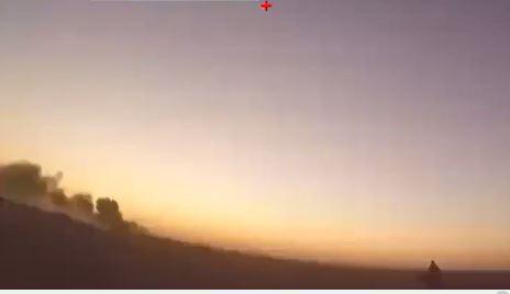 Бронированный автомобиль боевиков не виден на видеозаписи, но яркая вспышка показывает, что пушка, по видимому, установленная на пикапе, стреляет.
