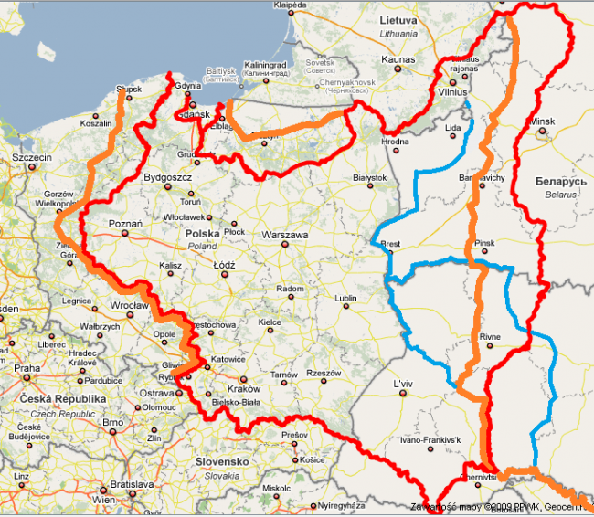 Вот, скажем так, набрел на просторах интернета на забавную карту с границами Польши-1939 (красная линия) и возможными границами в будущем (оранжевая линия) с вариантами (синяя линия)