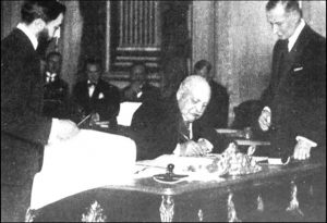 Архивы Sysselmannen Норвежский дипломат и переговорщик Фриц Ведель Ярлсберг подписывает Шпицбергенский трактат в Париже в 1920 году.