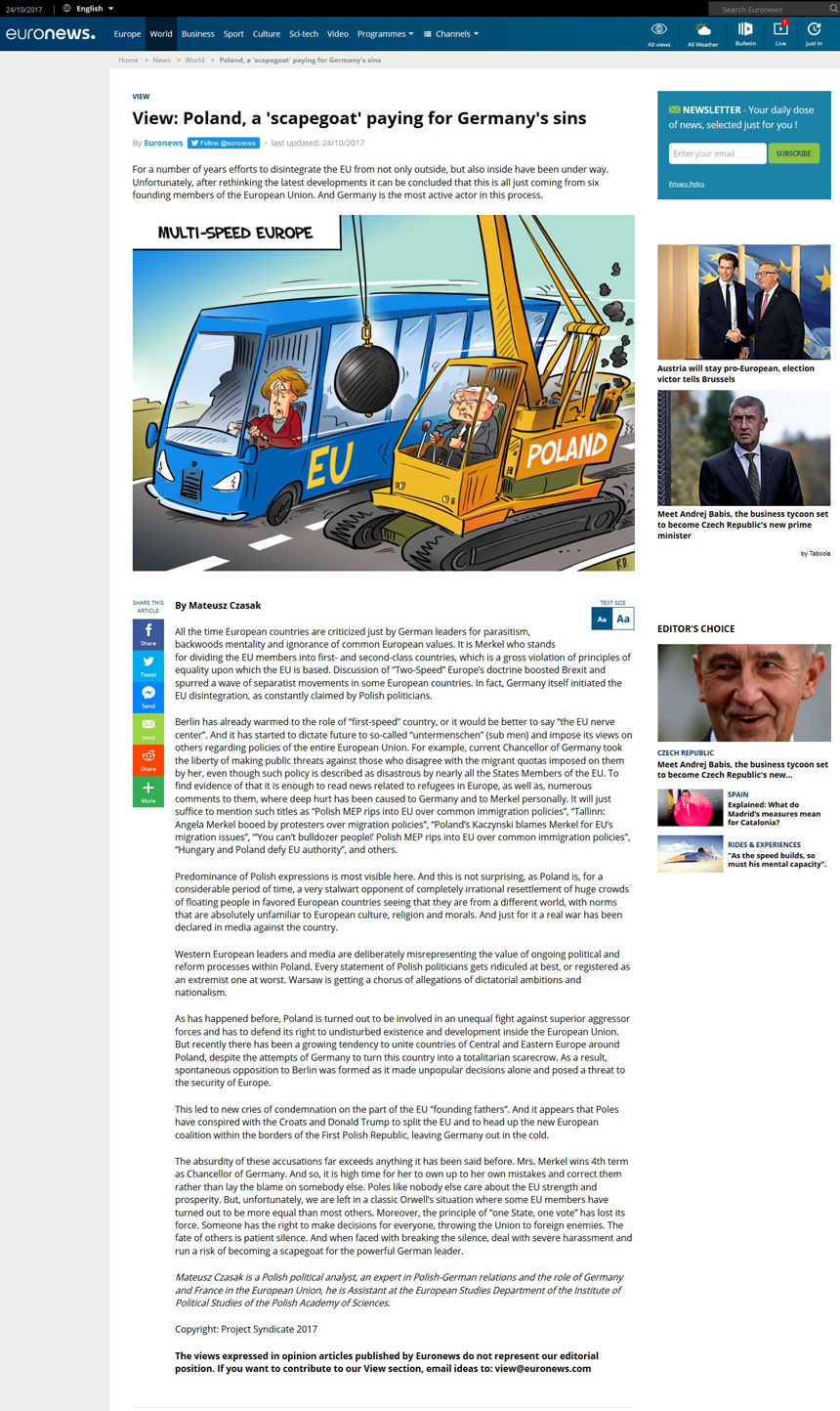 Начав с жалоб на горькую польскую долю и обвинений СМИ в предвзятости, пан Чазак на протяжении всего опуса упражняется в антигерманской риторике, затрагивая больную тему о кризисе беженцев в Европе и открыто призывая бойкотировать решения Европейского парламента. И лишь одна Польша вся в белом смело противостоит имперским амбициям Германии, вернувшейся в свое фашистское прошлое. В финале автор демонстрирует свое знание целой одной цитаты Оруэлла и прямым текстом записывает огромную группу государств во "внешние враги" ЕС.