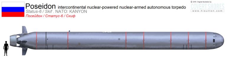 Вне западных разведслужб, “Посейдон” впервые был замечен в ноябре 2015 года, когда картинка была «случайно» показана на российском государственном телевидении. Оружие имеет длину 65 футов и ширину 6,5 фута. Обладая атомным двигателем, он может пройти тысячи миль со скоростью до 70 узлов. Термоядерная боеголовка “Посейдона” предназначена для уничтожения прибрежных районов, таких как порты, города и экономическая инфраструктура. В результате взрыва образуется цунами из радиоактивной воды и мусора, которое понесет опустошение дальше вглубь страны и превратит огромные площади в непригодные для жизни в течение многих поколений.