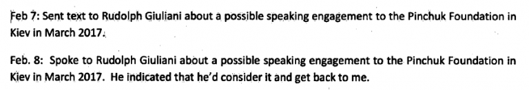 Было написано письмо непосредственно Трампу; его также косвенно обрабатывали через его личного адвоката Руди Джулиани. За значительный гонорар в качестве докладчика он также был приглашен на встречу в Киев ради лоббирования Пинчука.