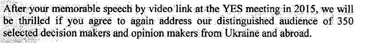 После вашей незабываемой речи по видеосвязи на встрече YES в 2015 году мы будем в восторге, если вы согласитесь снова выступить перед нашей именитой аудиторией из 350 избранных ключевых фигур и формирующих общественное мнение лиц из Украины и из-за границы.