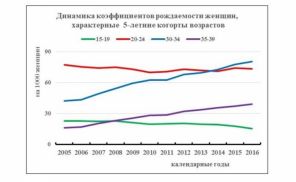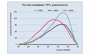 Официально репродуктивные возрасты женщин — это 15−49 лет. Но следует отметить, что около 95% всех рождений 1987 и 2006 годов приходится на 17−35 лет. То есть на этом календарном интервале, почти за 20 лет, поведение функции возрастной рождаемости осталось неизменным. Изменялась лишь интенсивность рождений женщин младших возрастов.