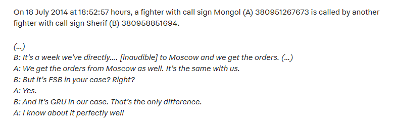 В этом разговоре между солдатами на месте отсутствует любая отсылка к одному событию на поле боя, о котором оба мужчины должны были знать, если голландская интерпретация является правдивой. Объединенная следственная группа не разъясняет то, что отсутствует. Вместо этого она утверждает: "Перехваченные телефонные разговоры также, видимо [sic], показывают участие российских спецслужб, работающих совместно и руководящих ДНР. Например, 18 июля 2014 года два члена ДНР обсуждают, что они оба получают приказы из Москвы; один от ФСБ, а другой от ГРУ".