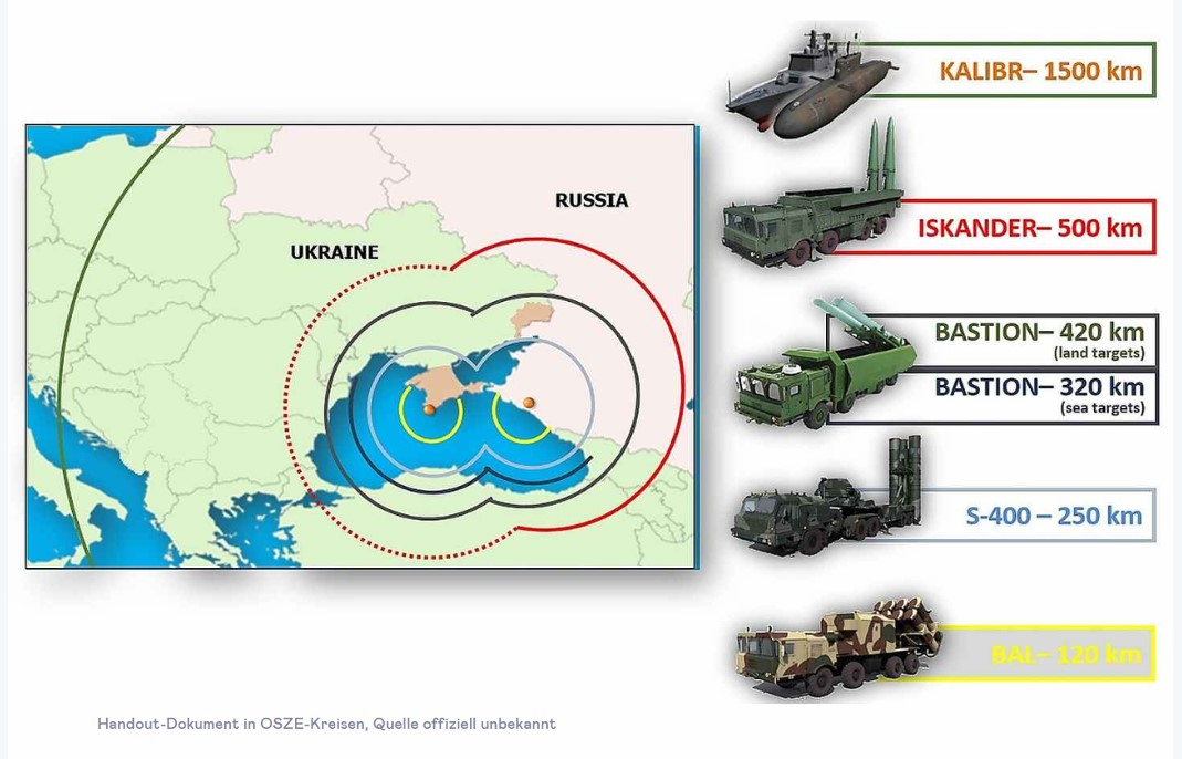 Западная Европа в пределах досягаемости? Эта глава неофициальной презентации завершается оценками и предположениями о том, как российская сторона может иметь возможность еще больше повысить свои боевые возможности в Крыму в случае обострения напряженности или конфликта. В то время как размещение наступательных, а также ядерных ракет «Искандер» класса «земля-земля» уже упоминалось, достоверные свидетельства, описывающие размещение специальной версии «Искандера» в Крыму, отсутствуют, а именно комплексов «Искандер-К» или «Искандер-М».