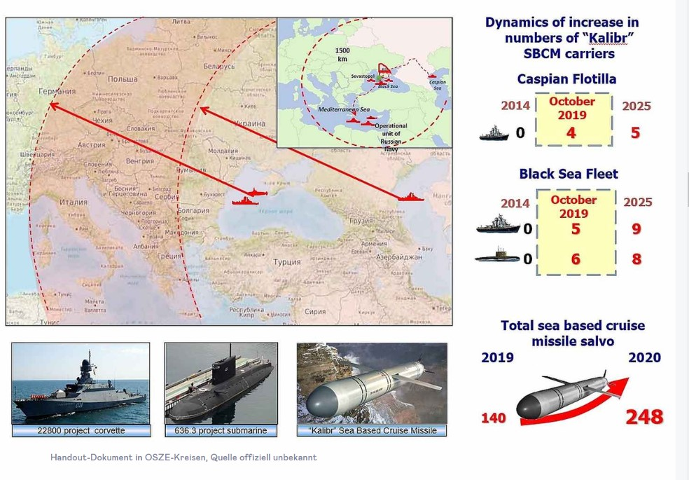 На этом слайде показаны диапазоны ракет «калибр» Черноморского флота и Каспийской флотилии, а также некоторых связанных с ними кораблей и подводных лодок, пригодных для запуска ракет «калибр». Их общее количество (теперь 15), а также предполагаемое общее количество увеличения ракет (с 140 на 248) с 2019 года.