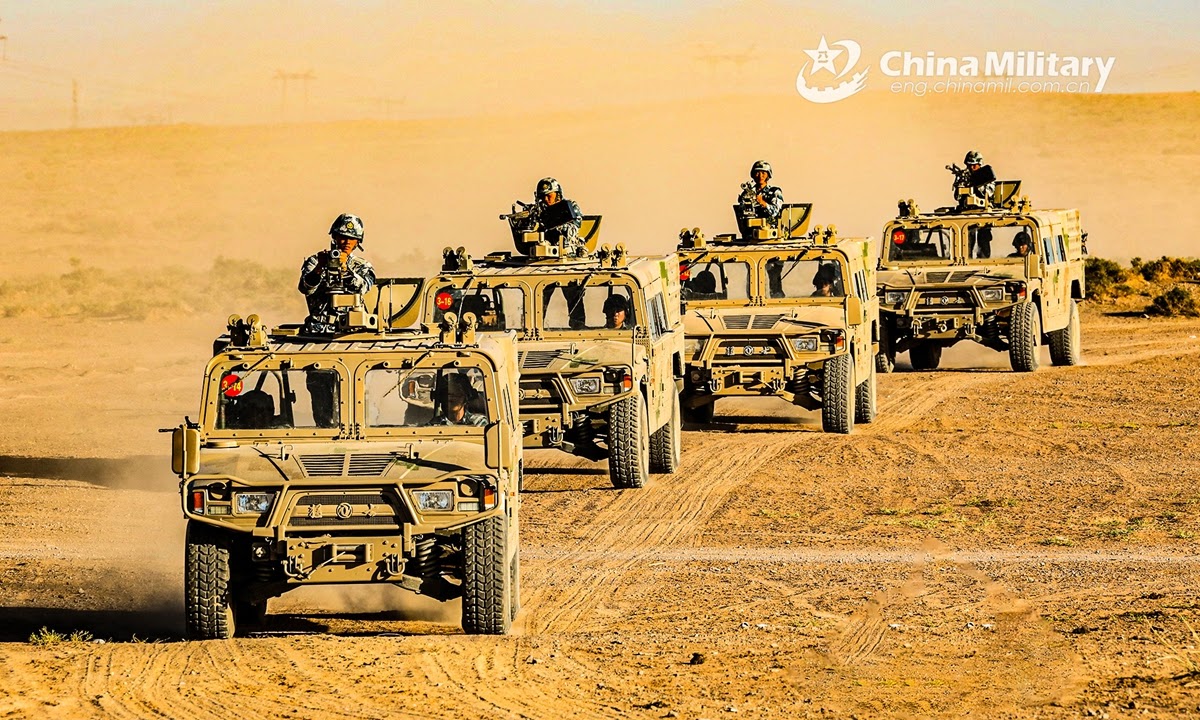 Колонна внедорожников Dongfeng Mengshi с колесной формулой 4x4, приданная бригаде воздушно-десантных войск НОАК, направляется на полигон через пустыню Гоби на северо-западе Китая для проведения комплексных тактических учений Photo:China Military