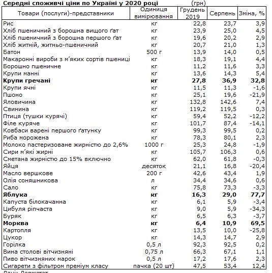 По данным ведомства, за январь-август яблоки подорожали на 77,7% до 29 грн за кг, морковь — на 69,5% до 10,9 грн за кг, цены на крупу гречневую выросли на 32,8% до 36,9 грн за кг.