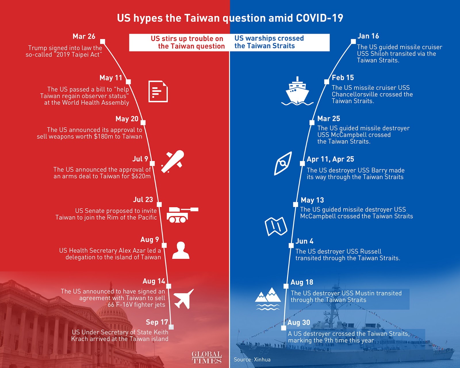 США также пытаются провоцировать Китай по тайваньскому вопросу и в ООН. ABC News сообщила в четверг, что посол США в ООН Келли Крафт в среду обедала с Джеймсом Ли, директором Тайбэйского экономического и культурного офиса в Нью-Йорке. Крафт назвала встречу «исторической» и очередным шагом в кампании администрации Трампа по укреплению отношений с островом. Крафт рассказала, что она и Ли «обсудили различные способы, с помощью которых мы можем наилучшим образом помочь Тайваню активнее участвовать в ООН».