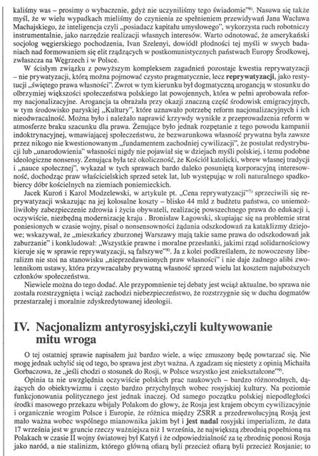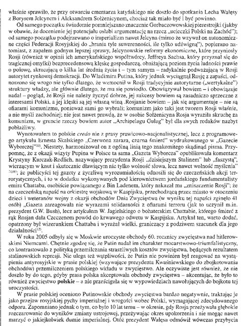 К Владимиру Путину, который вытащил Россию из пропасти, относились враждебно не только потому, что он укрепил авторитарную традицию в России ("вертикаль власти"), но главным образом потому, что он преуспел. Ведь обязывало – и до сих пор остаётся в силе – мнение, что России не следует желать успехов, потому что её успехи в корне противоречат польским интересам, а её поражения происходят по её собственной вине. Ведь русские – так это аргументировалось – не являются жертвами коммунизма, так как они сами его выбрали, коммунизм как таковой является творением именно России, а не западной мысли, и что неправда даже то, что устами Солженицына Россия выразила раскаяние за коммунизм, потому что автор книги "Архипелаг ГУЛАГ" был для своих соотечественников якобы слишком снисходителен.