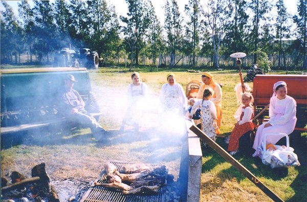 Через пару встреч уже пригласили в гости. Нам интересно конечно было, поехали. Дороги в Уругвае хорошие, 70 км по шоссе до ближайшего к ним маленького городка и лишь последние 20 км по грунтовке. Деревня стоит на реке Кэгвай, основали её около 25 лет назад. Восемь дворов, около 2 тысяч гектар собственной земли - пашня и пастбище для скотины. Только одеты все по старинному в сарафаны и вышитые рубахи с поясками, а в остальном только телевизоров нет да компьютеров. Пикапы практически у всех, трактора, комбайн. Электричество, свои водяные скважины с насосами. Телефоны в нескольких домах и практически у всех мобильники. Радио в каждом пикапе, только при въезде в деревню его положено выключать. Дома просторные, обшитые внутри деревянными панелями.