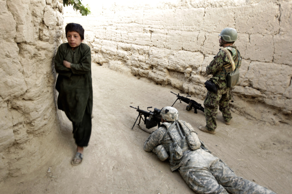 Мальчишка-афганец идёт позади американского и афганского солдат в деревне Сайдон Калаче, долина Аргандаб, 11 сентября.