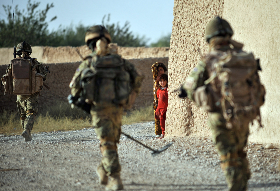Афганские дети наблюдают, как солдаты-гуркхи из британского контингента прочёсывают местность в поисках взрывных устройств во время патрулирования Нахр-и-Сарай, провинция Гельманд, 28 июня.