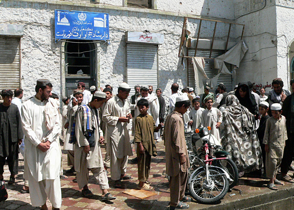 Афганцы собрались вокруг бомбы, установленной на мотоцикле. Мотоцикл был оставлен перед входом в госучереждение в Кандагаре, 1-е сентября.