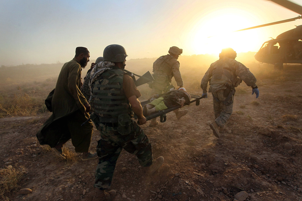 Афганец сопровождает американских солдат, несущих его раненую шальной пулей 12-летнюю племянницу, к эвакуационному вертолёту. 20 сентября 2010 г., вблизи Марджа, Афганистан.
