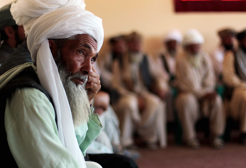 Старейшины сидят во время встречи деревенского совета (шуры) с афганскими госчиновниками и американскими офицерами, 29 июня.