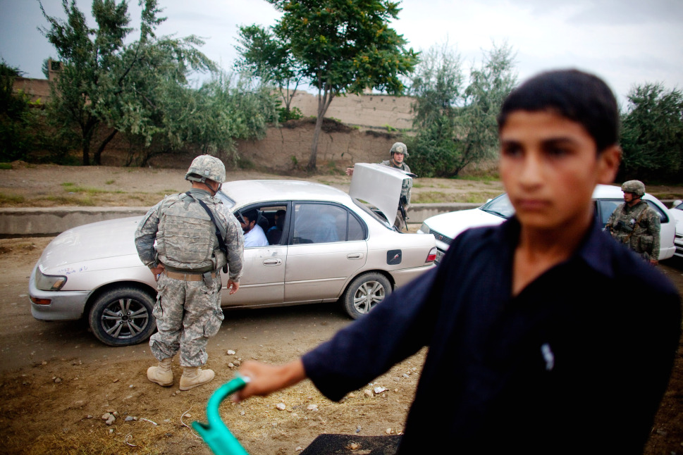 Афганский мальчик проезжает мимо американских пехотинцев, обыскивающих машины в поисках пропавшего американского моряка, КПП на дороге Кабул – Баграм, 28 июля.