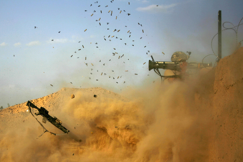 Американский солдат отвечает огнём на посту боевого охранения Нолен, долина Аргандаб, во время атаки Талибана, 11 сентября.