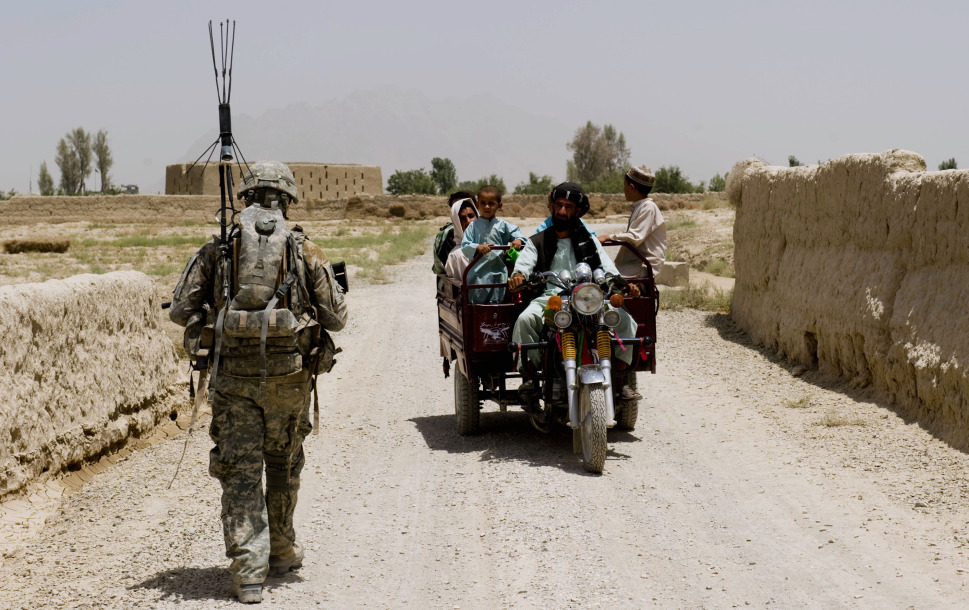 Афганские крестьяне едут мимо американского солдата, патрулирующего их деревню, в округе Данд, провинция Кандагар, 19 июля.