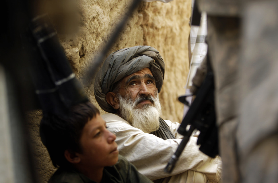 Старик-афганец и мальчик слушают американского солдата, патрулирующего деревню Сайдон Калаче, долина Аргандаб, 11 сентября.