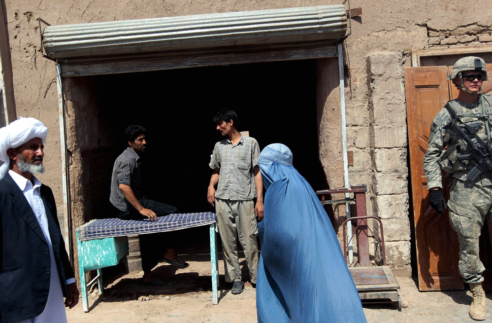 Мирные афганцы и американский десантник на оживлённой торговой улице Герата, 26 июня.