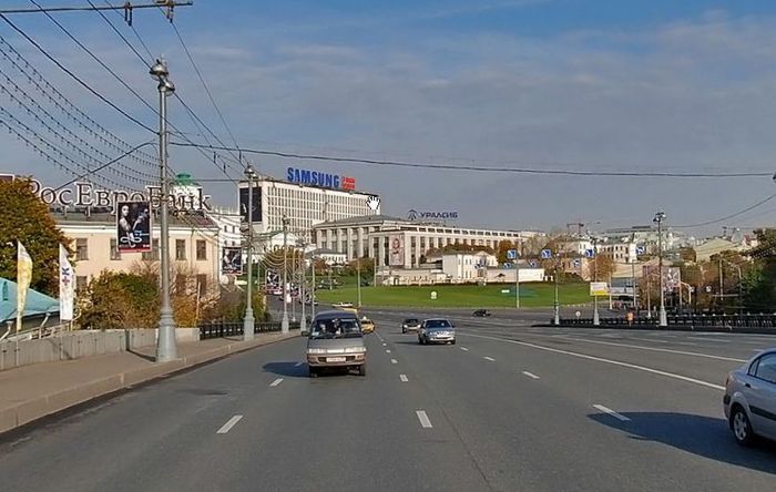 Кстати, а вот вывеска "Самсунга", которая стоит на торчащем уродливом здании со стороны Строгановского переулка, движение "Архнадзор" совсем не заботит, хотя оно не просто уродует вид с Боровицкой площади - оно просто уничтожает вид на исторический облик данной площади и дом Пашкова. Может быть просто компания "Самсунг" отстегнула баблища этому движению, и поэтому они не возникают по этому поводу. Кстати, там ещё и вывеска "Уралсиба" есть примерно таких же размеров. Но к ним, как мы видим, у данной организованной группировки архитекторов претензий нет.