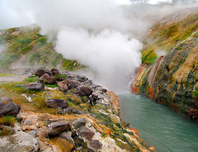 Кроме Камчатки, крупные гейзеры есть в трех местах на планете - в Исландии, Новой Зеландии и США. Однако и в этом малом ряду камчатская Долина выделяется своей уникальностью. На небольшом пространстве (2 на 4 километра) здесь можно наблюдать почти все известные науке разновидности термопроявлений. Кроме гейзеров - это грязевые котлы, термальные площадки, горячие источники, водопады и т. д. Их обрамляют необычные водоросли, бактерии, растительность самых невероятных расцветок. Для сравнения: в Йеллоустонском парке в США от одного гейзера до другого нужно ехать километров 50 по асфальтированной дороге. На Камчатке же все это богатство находится на расстоянии экскурсионной тропы. Правда, на машине, как в Америке, сюда не доберешься. Только вертолетом можно долететь. Поэтому и посещают Долину гейзеров 2-3 тысячи человек в год. Йеллоустонский парк, к слову, не менее 3 миллионов.