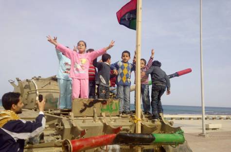 Ливийские дети, стоящие на танке и скандирующие лозунги против Каддафи, рядом с офисом временного правительства.