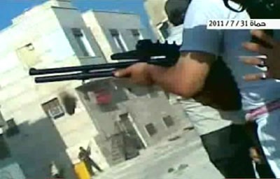На видео показаны мужчины, вытаскивающие с грузовика несколько окровавленных трупов - как минимум семь трупов - и бросающие их с моста в реку Оронт, которая протекает через Хаму - город, где в течение недель проходят демонстрации и насильственные беспорядки, и бастион радикальной исламистской оппозиции сирийских "братьев-мусульман". Хотя местоположение (на видео) легко узнаётся жителями Хамы, но всегда могут быть вопросы о личности преступников. Однако крики "Аллах о акбар!", сопровождающие это надругательство над телами, достаточно хорошо указывают на происхождение этих людей: это сочувствующие или активисты "братьев-мусульман", о которых известно, что у них есть оружие. Это оружие хорошо видно на другом видео, присланном другим посетителем нашего сайта; это видео длительностью 11 минут показывает один из кварталов Хамы, находящийся под контролем восставших. Это вооружённое восстание, как это видно по участникам боевых действий, одетых в стиле "моджахедов" с закрытыми куфией лицами и автоматическим оружием - АК 47 - или ружьями Remington или Franchi в руках (см. фото ниже); в течение всего этого "репортажа", по всей видимости, сделанного мобильным телефоном, можно слышать звуки перестрелки; можно ясно видеть типичных бородачей, одетых в традиционные джелаба. Видео заканчивается видом сваливаемых на платформу грузовика окровавленных трупов.